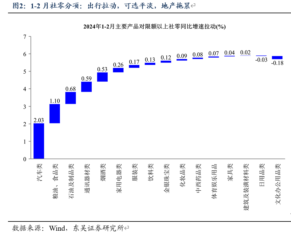消费:春节外的成色不足。火热的春节消费并未带动年初的整体社零数据超预期,2024年1-2月5.5%的社零同比增长符合趋势水平,而结构上也基本延续了“出行拉动,可选平淡,地产拖累”格局,显示居民在假期外消费情绪依然平淡。其中汽车可能继续“低价换量”,而假期涨价带动了食品与燃油项零售额,这三者主要拉动了1-2月社零;通讯与家电在可选项中相较突出;而家具与建材继续跟随地产竣工表现低迷。