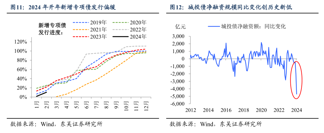 接下来国债的“利”,可以对冲地方发债规模偏小的“弊”。今年以来与基建相关的两种地方债发行进度都偏缓——一是对比前五年1-2月地方新增专项债的发行情况来看,今年专项债的发行进度仅快于2021年同期;二是在化债基调之下,城投债净融资同比变化规模创下历史新低。不过,前有2023年增发万亿国债中的一半结转到2024年使用,后有政府工作报告中“官宣”的超长期特别国债为投资建设“保驾护航”。