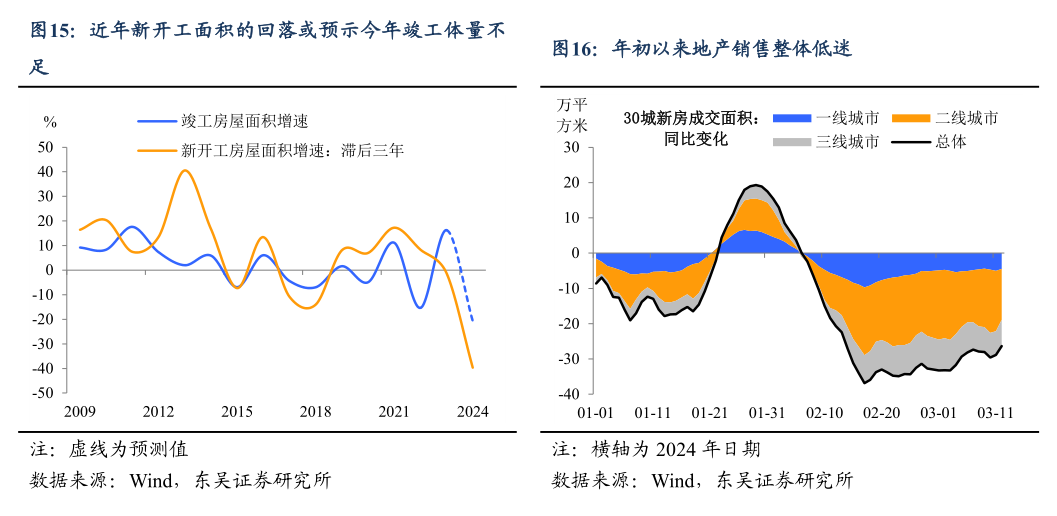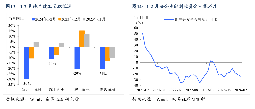 地产:降幅边际收窄,但不足以企稳。2024年1-2月地产投资累计同比-9.0%,较去年年末的单月同比降幅收窄,其中主要建工与销售面积继续回落,其中竣工面积的同比转负有去年高基数的因素。值得关注的是1-2月房企开发资金同比下降24.1%,到位资金不足可能是近期开工施工偏缓的压力之一。