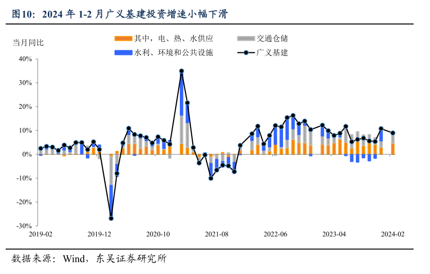 基建:“逆风局”下的小幅降温。2024年1-2月广义基建投资增速为8.9%(2023年12月为10.7%),较前值有所下降。年初公用事业与交通仓储两大板块均在升温,导致广义基建整体降温的“导火索”主要在于水利、环境和公共设施投资增速的明显下降。