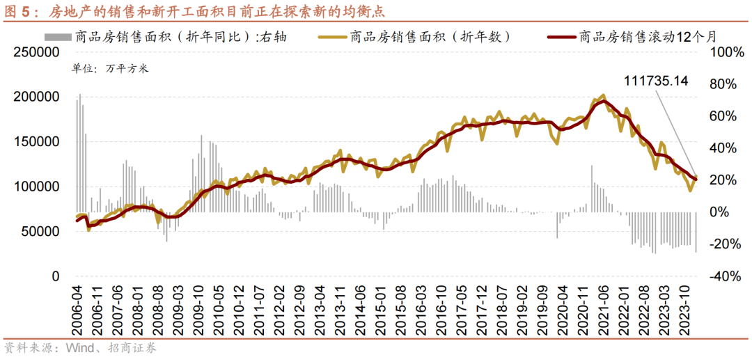 至2023年10月,商品房销售面积滚动12月为11亿平,商品房新开工面积为9.5亿平,目前尚未看到明显企稳的迹象,不过随着基数降低,未来的增速降幅将会逐渐收窄。
