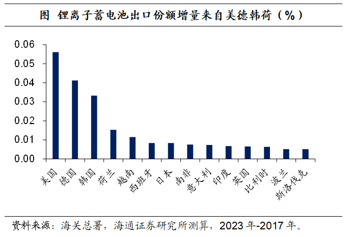 哪些制造:优势提升?若从商品角度来看,截至2023年,车辆、航空器、船舶及运输设备和机电、音像设备及其零附件两大类商品出口份额提升较多。基于HS2位编码测算的话,出口份额提升较多的商品是车辆及零件等、电机电气设备、塑料及制品以及钢铁制品。若基于HS6位编码测算的话,出口份额提升较多的是低值简易通关商品(输送美国)、锂离子蓄电池(输送美欧)、电动载人汽车(输出欧洲)以及太阳能电池(输送欧洲)。