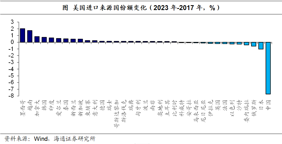 进一步来看,相比2017年,至2023年底美国自我国进口份额下滑最多,下滑了约7.7个百分点;其次,下滑较多的为日本和俄罗斯,分别下滑了1.0个百分点和0.6个百分点。而美国进口需求并未大幅萎缩,在从我国、日本以及俄罗斯等进口减少下,从墨西哥、越南、加拿大、韩国以及印度等地进口明显增加。