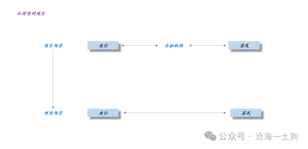 如上图所示,站在游戏规则制定者的角度来看,他们希望央行直接跟居民互动,并不希望有个中间人在里面搞东搞西。