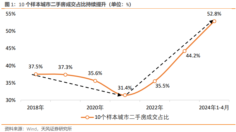 当前房地产市场的压力是长期供求关系的转变,核心矛盾是估值偏贵、预期偏弱、库存偏高(详见报告《趋势延续——2024年房地产市场展望》,2024.1.13)。其中库存偏高,体现为长期预期发生变化之后,二手房成为了房屋交易市场的主要增量供给。