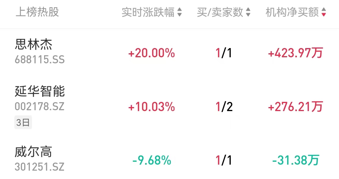 今天机构龙虎榜上榜23只个股,净买入2只,净卖出21只。当日机构买入最多的个股前两分别是思林杰(423.97万)、延华智能(276.21万)