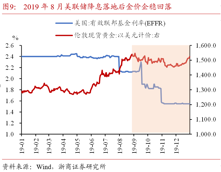 美联储降息后,利多出尽可能带动中国国债收益率走高。参考2019年美国降息周期,2019年8月前,降息预期之下10年期美国国债收益率迅速走低,金价同样大幅上涨,而8月降息落地后10年期国债收益率短暂下行并于9月开始回调,金价亦出现企稳回落。市场往往提前交易预期,而利好落地之后止盈,如果美联储于2024年9月降息,则利好落地之后四季度可能迎来美债回调,对中债的影响中性偏空。