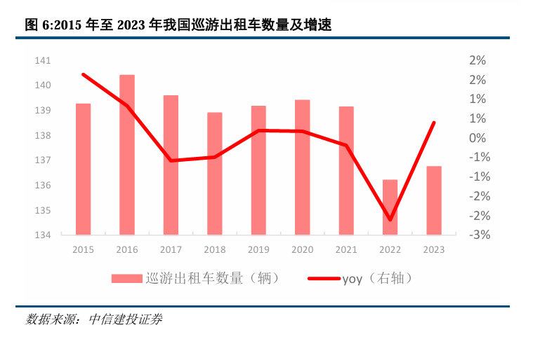 (2)巡游出租车数量:据交通运输部数据,2023年我国巡游出租车达到136.74万,同比增长0.40%。由于巡游出租车受到网约车的冲击,我们假定其数量逐年下滑1%,到2030年数量为127.45万。