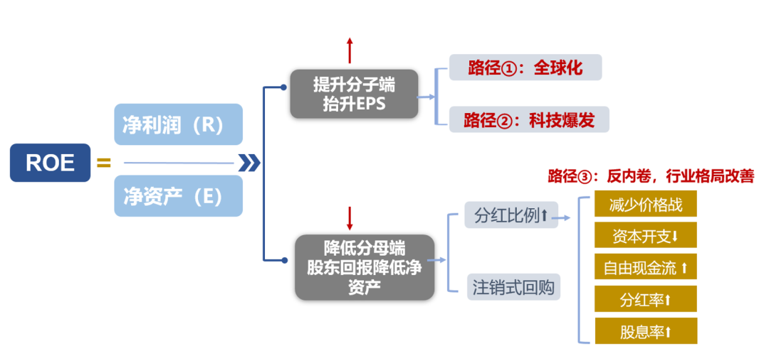 估值中枢的讨论需要建立在稳定盈利能力(ROE)的基础之上,随着越来越多企业资本开支的缩减、自由现金流的改善,提供了一种可以维持ROE的方式——通过更多分红和注销回购来减少净资产(ROE的分母),从而抵消EPS的波动(ROE的分子)。