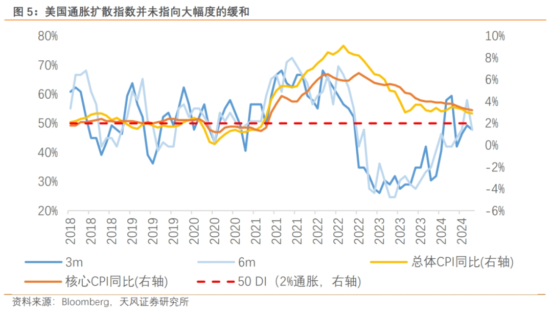最后,我们观察到基于四级分项的通胀扩散指数也并未指向大幅度的缓和,对未来去通胀的期待或许还得再低一些。
