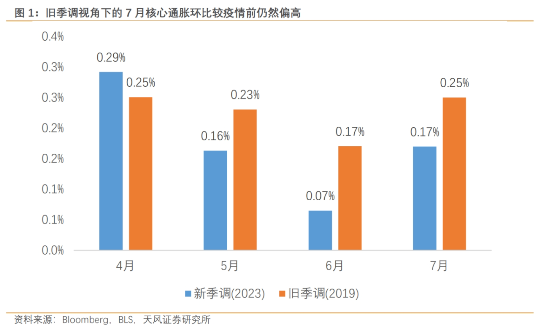 在上个月报告中,我们提到季调因子压低了近期的通胀读数。我们延续这一调整方法,该方法计算下的7月核心通胀环比在0.25%左右,从可比性的角度来看,还是明显高于疫情前水平。
