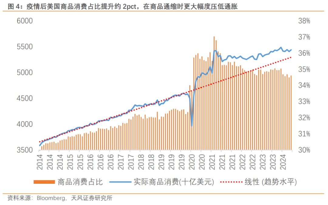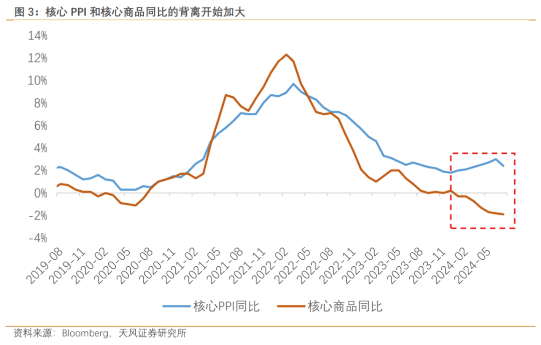 2024年以来,本应同步的美国PPI与核心商品同比增速的背离幅度进一步加大。考虑到当前美国商品消费占比较疫情前提升了约2个百分点,核心商品价格的历史性通缩可能很难持续。