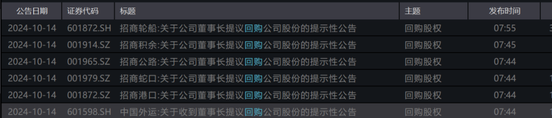 与此同时,招商轮船、招商积余、招商公路、招商港口均发布回购公告,回购金额分别达到不低于人民币2.22亿元(含),不超过人民币4.43亿元(含);不低于人民币0.78亿元(含),不超过人民币1.56亿元(含);不低于人民币3.1亿元(含),不超过人民币6.18亿元(含);不低于人民币1.95亿元(含),不超过人民币3.89亿元(含)不等。