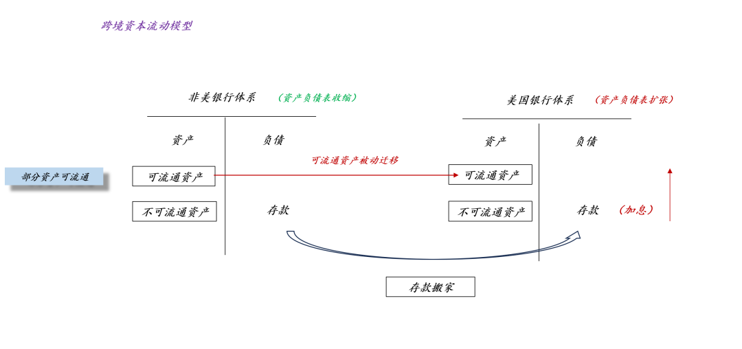 如上图所示,我们可以把美国银行体系和非美银行体系看成两家普通的商业银行,这两家银行遵循简单的“存款搬家”逻辑。如果美国是一个普通国家,那么,它不得不保持较高的联邦基金利率水平,否则,存款会大幅流出美国银行体系,导致美元贬值。