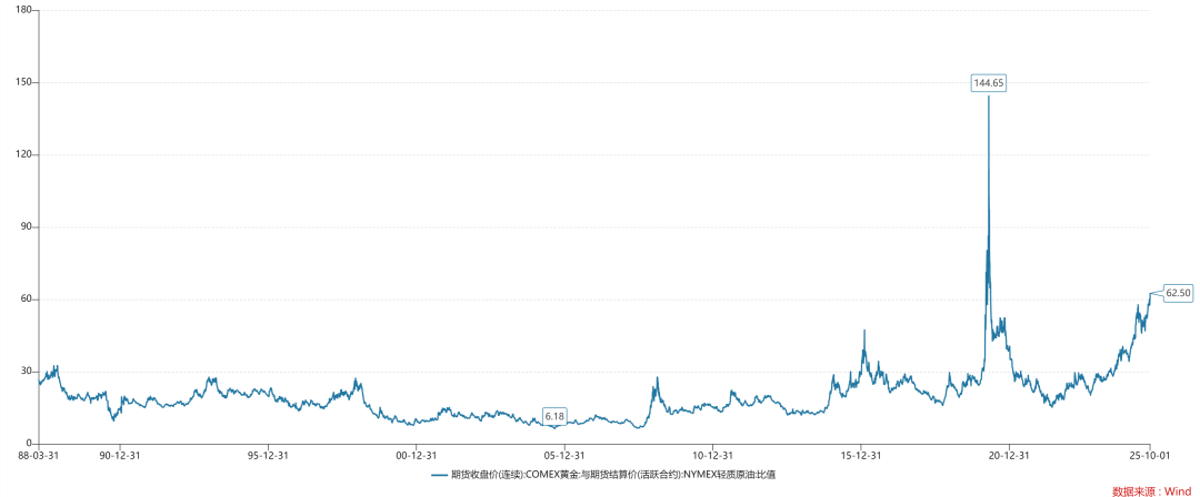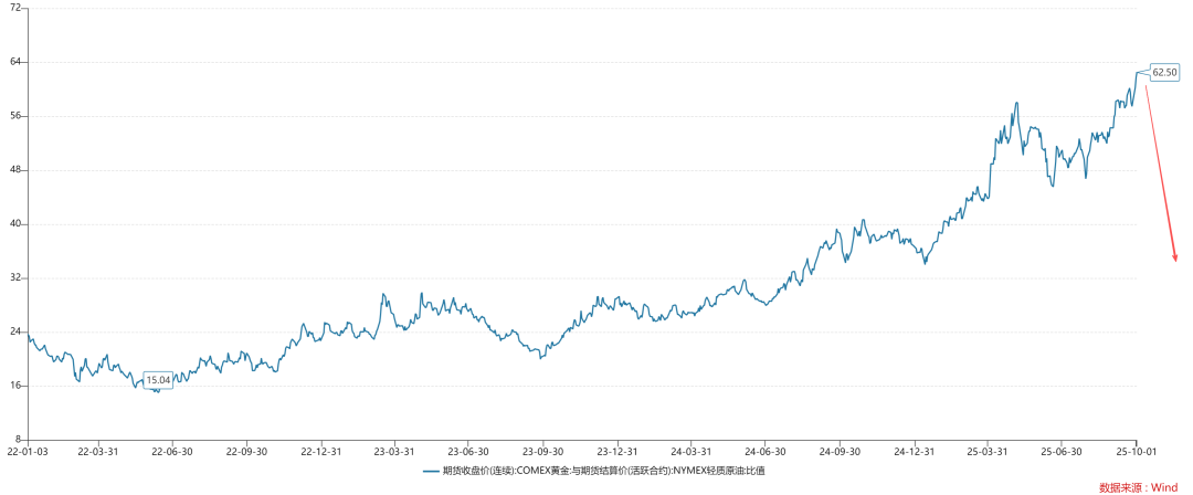 另一次是2022年俄乌战争爆发以来,金油比趋势性攀爬,已经震荡攀升至62.5附近;