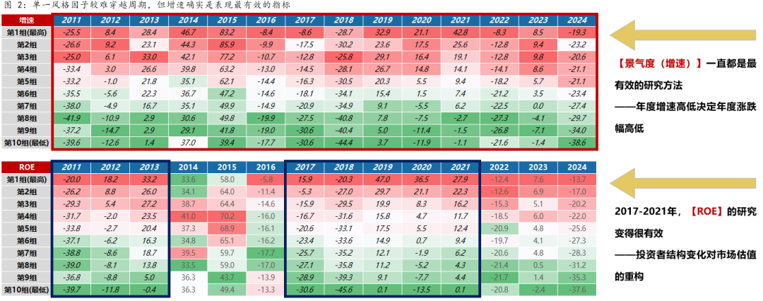 在图(2-4)的A股复盘中,我们可以看到,以年度为单位,利润增速的快慢与股价表现的相关性非常不错,这也是景气投资有效性的重要体现。