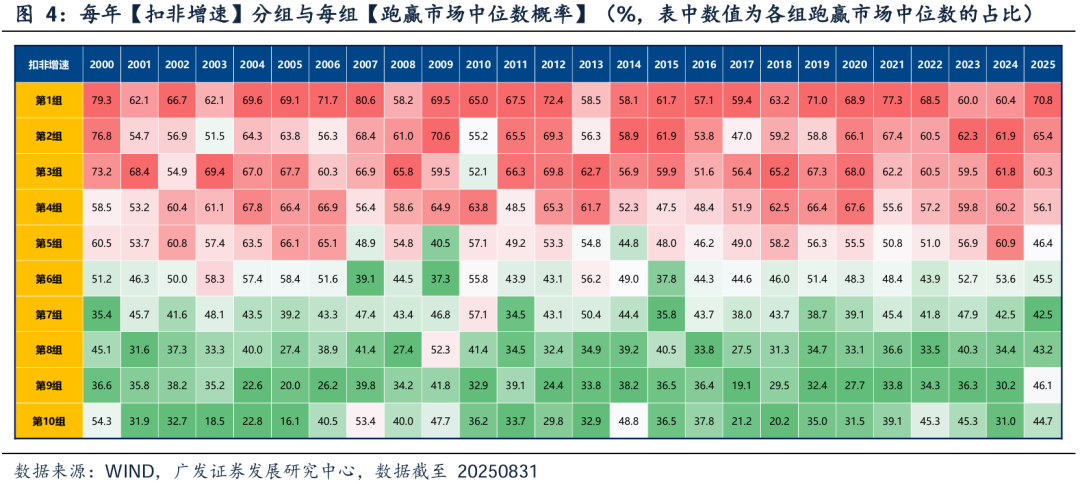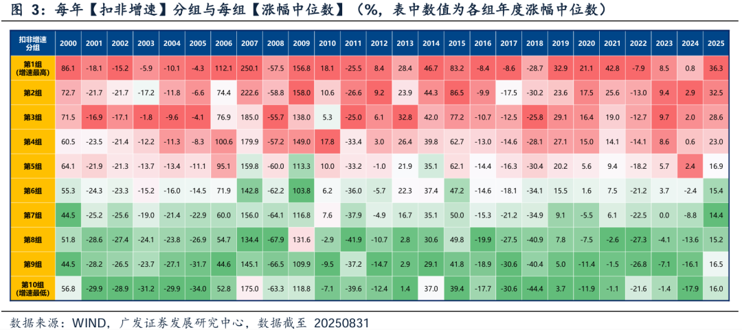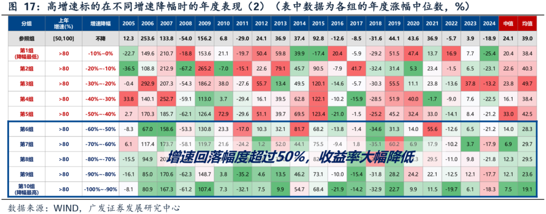 可以发现规律:(1)增速边际回落,但维持较高增速的标的,仍有超额收益(第1组~第5组);(2)第4组是临界线(增速>30%),当增速降至30%以下,市场表现显著变差。
