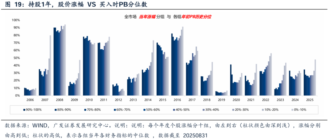 (长周期回报,买的便宜很重要:1年维度,PB高低与涨跌幅相关性不显著,但3年或5年维度,低PB的有效性明显加强。)