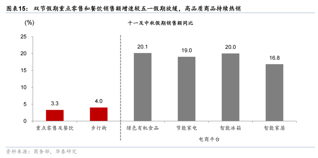 据商务部监测,国庆假期前四天全国重点零售和餐饮企业销售额同比增长3.3%,增速较“五一”假期(同比增长6.3%)有所回落,但高于更多受商务需求拖累的6-8月餐饮同比1.4%,或显示个人家庭消费仍有韧性。据商务部监测,全国重点零售和餐饮企业销售额同比增长3.3%,增速较2025年“五一”假期(同比增长6.3%)有所放缓。国庆假期前3日监测数据显示,全国78个重点步行街(商圈)零售与餐饮销售额同比增长4.0%,客流量同步增长4.2% ,但较“五一”期间50个步行街和商圈客流量同比增速6.4%有所放缓。从商品结构看,绿色有机食品、节能家电、智能家居等高品质商品持续热销。