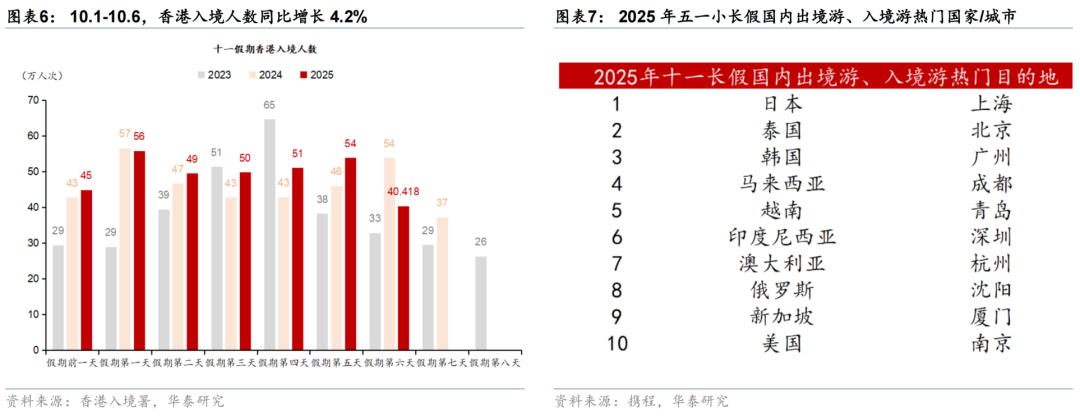 港澳出游人次增长略弱于整体水平。十一假期首日,入港、入澳人数略超去年同期——10月1日,澳门内地入境旅客数同比增长1.6%;截至10月6日,十一长假期间香港累计入境旅客数较去年同期增长4.2%(图表6)。