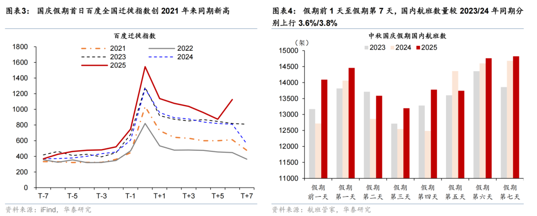 居民出游意愿进一步增长。从百度迁徙指数刻画的人口的跨区域流动情况看,国庆中秋假期首日百度全国迁徙指数同比增长22.2%,假期前7日人流量同比增长20%(图表3)。值得注意的是,今年国庆与中秋假期合并共8天假期,可“请3休12”拼出12天长假,较2024年的“请2休10”略长,亦推动居民出行半径进一步扩张——根据去哪儿数据,今年打工人前后“拼假”比例超三成。