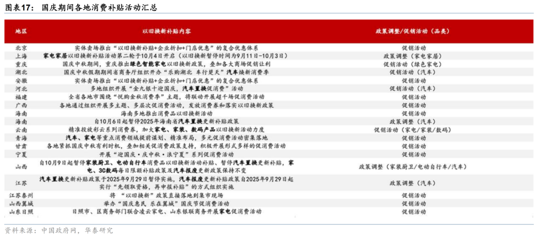 今年国庆假期期间,多地继续通过文旅消费券促进假期消费增长,但部分省份以旧换新补贴政策有所调整。9月25日,2025年全国国庆文化和旅游消费月主场活动在成都举办,于9月下旬至10月下旬将举办超2.9万场次文旅活动,发放超4.8亿元消费补贴。但国庆期间的“以旧换新”补贴总体略有放缓——如海南自10月6日起暂停2025年海南省汽车置换更新补贴政策,山西自10月9日起暂停家装厨卫、电动自行车消费品以旧换新活动补贴、暂停汽车置换更新补贴,家电、3C数码每日限额补贴政策及汽车报废更新政策保持不变,江苏汽车置换更新补贴政策于2025年9月29日暂停实施,汽车报废更新补贴政策自2025年9月29日起实行“先领取资格,再申报补贴”的方式组织实施。