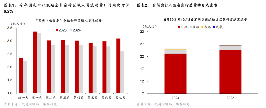 今年国庆中秋假期前1天-假期第8天(共9天)全社会跨区域人员流动量同比增长6.5%,高于去年国庆假期的日均增速3.9%,但略低于五一假期出行同比7.9%。交通运输部数据显示,今年国庆中秋假期(10.1-10.8)全社会跨区域人员日均流动量同比增长6.2%,总体仍保持较高增速、但较五一假期的同比增长7.9%略有放缓;分出行方式来看,铁路、公路、水路、民航发送旅客数量同比分别增加2.6%、6.5%、4.2%、3.4%,其中自驾出行人数同比增长7.1%、占人员流动总量的79.8%,显示自驾出行仍然是今年国庆中秋长假出行的主要方式(图表1-2)。具体看,