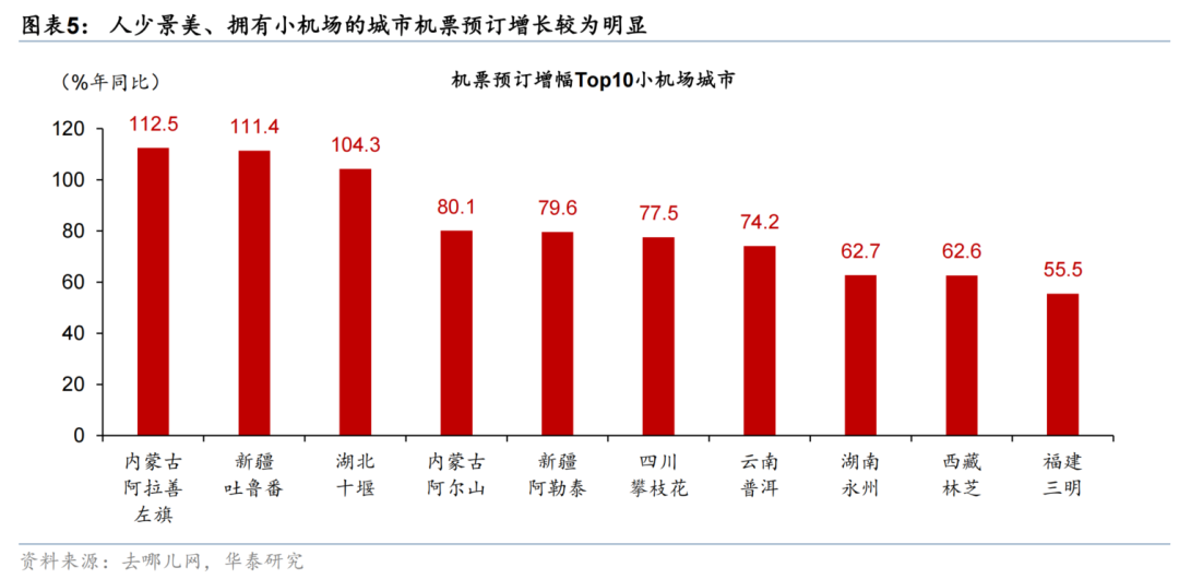国内航班数量持续上行,长途旅行热度持续。假期前1天至假期第7天,国内航班数量较2023/24年同期分别上行3.6%/3.8%(图表4),显示居民长途旅游意愿升温延续。其中,人少景美、拥有小机场的城市机票预订增幅亦较为明显,如去哪儿数据显示,今年国庆中秋假期,湖北十堰、新疆吐鲁番和内蒙古阿拉善左旗等地机票预订增幅均超过1倍(图表5)。