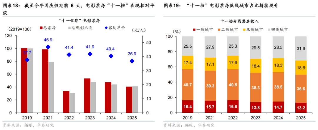 电影票房表现相对平淡,与居民的强劲出行需求或形成“镜像”效应。今年国庆期间电影票房表现弱于同期,根据猫眼专业版数据,十一假期前6天累计电影票房收入15.4亿元,日均票房2.57亿元,较2023/2024年同期下降24%/15%,较今年五一假期相比日均票房上涨56%。客单价来看,今年十一档平均票价约37元,较2019/2024年同期回落2%/12%。分线来看,三四线城市票房收入占比50.2%,较2024年的46.8%有所回升(图表18-19)。