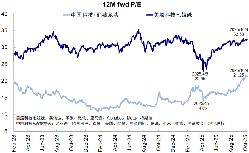 ► 第五,市场所处的位置不同。中美两地市场都已经有很多浮盈,且估值高于当时,但中国市场高出更多。美股尤其是七姐妹从2月DeepSeek异军突起“打破”美国AI一枝独秀地位后就已经开始回调。目前,美股“七姐妹”目前估值31倍左右,依然低于去年底今年初的高点33.7,4月对等关税前是26.8,大跌后低点23;中国科技与消费龙头当前的估值是20倍左右,高于3月底对等关税前高点的18.8,对等关税后的低点是14倍。