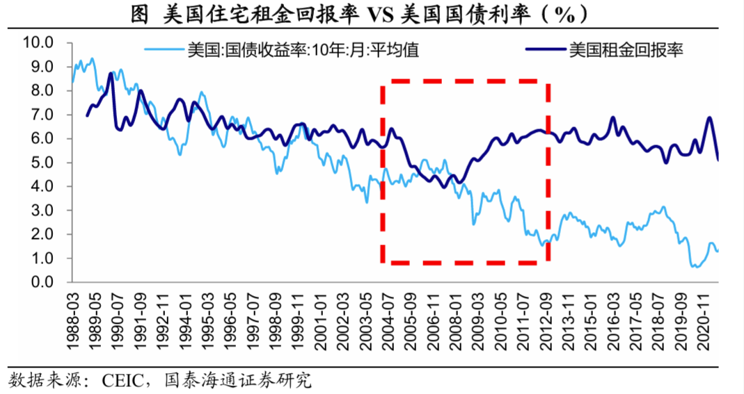 所以如果房价有上涨预期时,租金回报率就不重要,美国在07年之前的租金回报率一度比国债的利率还要低,居民仍然愿意买房;而如果房价没有上涨预期时,租金回报率需要远远高于国债利率(类似于信用利差大幅走阔),居民才会愿意买房。