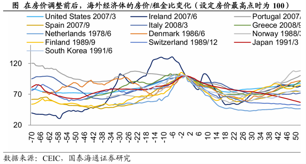 我们研究了13个经济体的房地产危机,发现它们有一个共同的规律:一旦房价进入调整周期,房子的估值往往会回到历史的估值低位,即租金回报率会回到历史最高位。这一规律和我们前面提到的股票市场的规律是一致的。其实我们做了大量的房地产研究,最大的体会是,房地产市场的很多规律和股票市场是一致的,不同的地方主要是股票为高频交易,股市的牛熊周期偏短;而房地产的交易周期偏长,房地产的牛熊周期偏长。