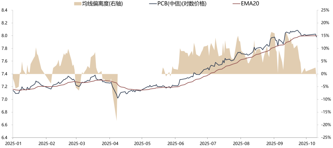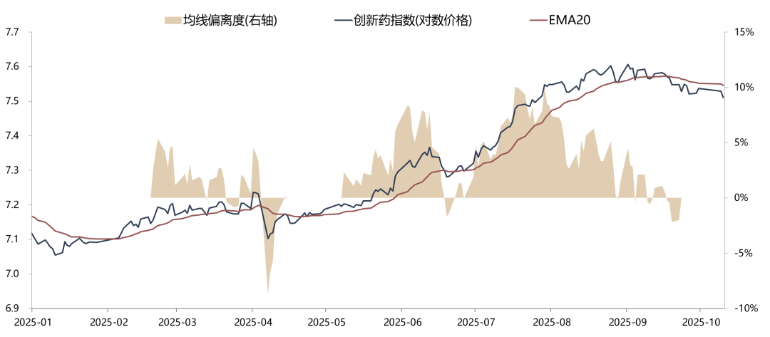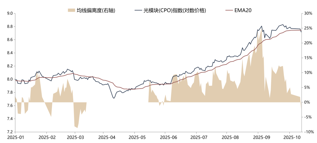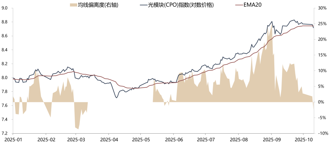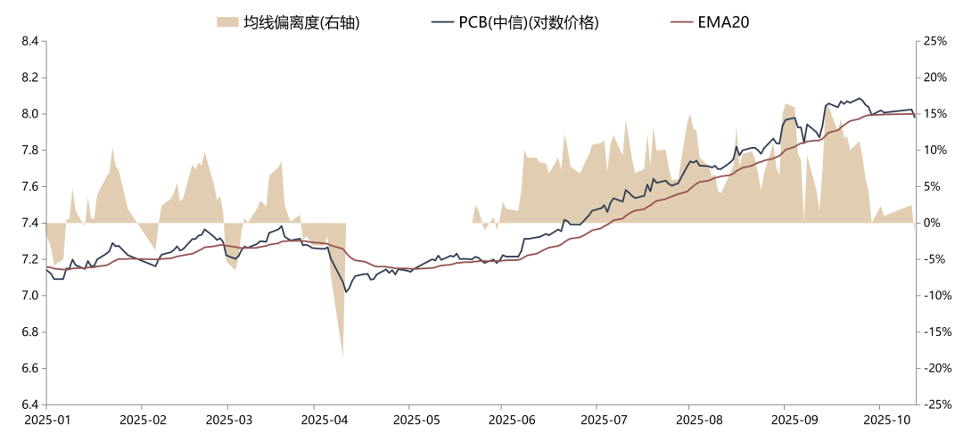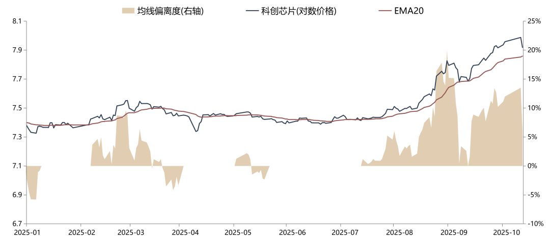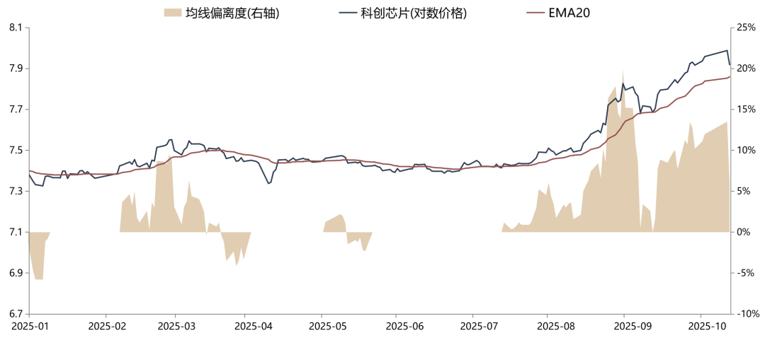 最后,我们在周报《如何区分主线是调整还是终结?20250914》中提出均线偏离度指标,以衡量主线行情趋势的强弱:均线偏离度=ln(Close)-ln(ema20),数值近似代表偏离百分比。