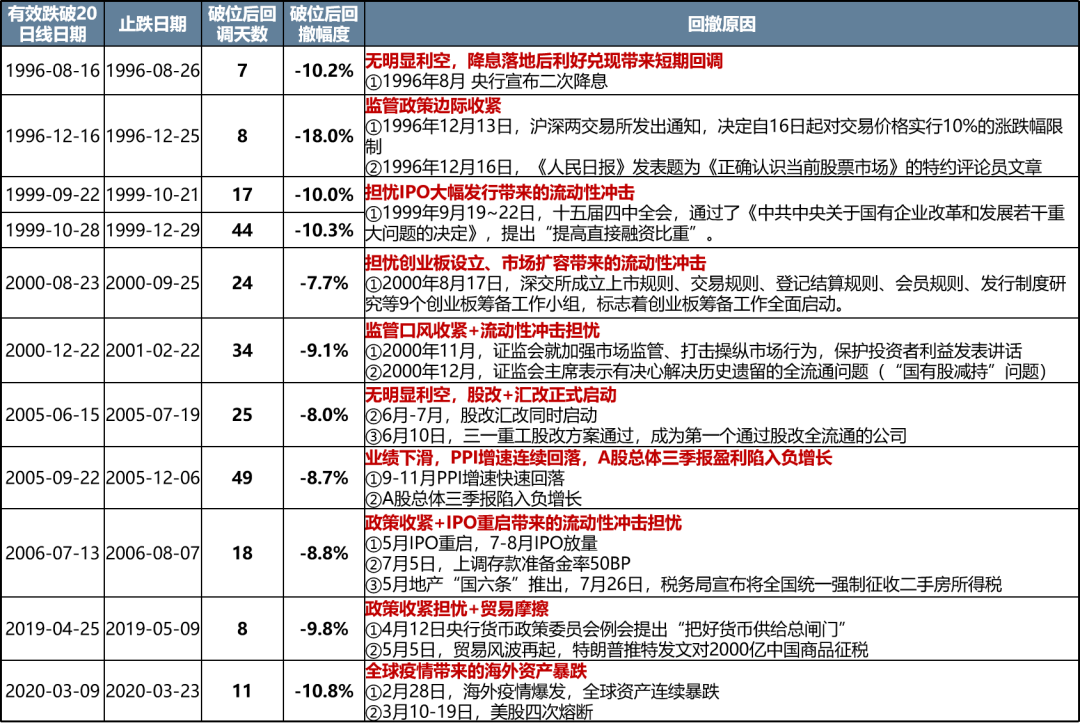 2.少数情形下(11/99次),如果出现贸易摩擦/外围波动/监管政策收紧等进一步的利空事件,指数在跌破20日均线后有可能继续下跌,平均再回调11个交易日,平均回调10%,也不会结束牛市的进程;