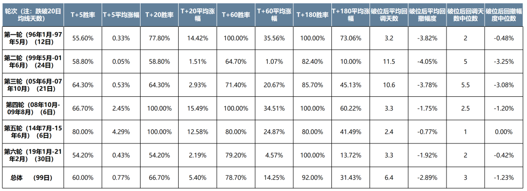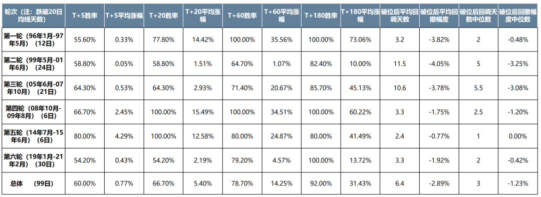 1.跌破20日均线后,市场在T+5、T+20、T+60、T+180胜率分别为60%,67%,79%,92%。即短期消化后,市场大多会重回涨势;