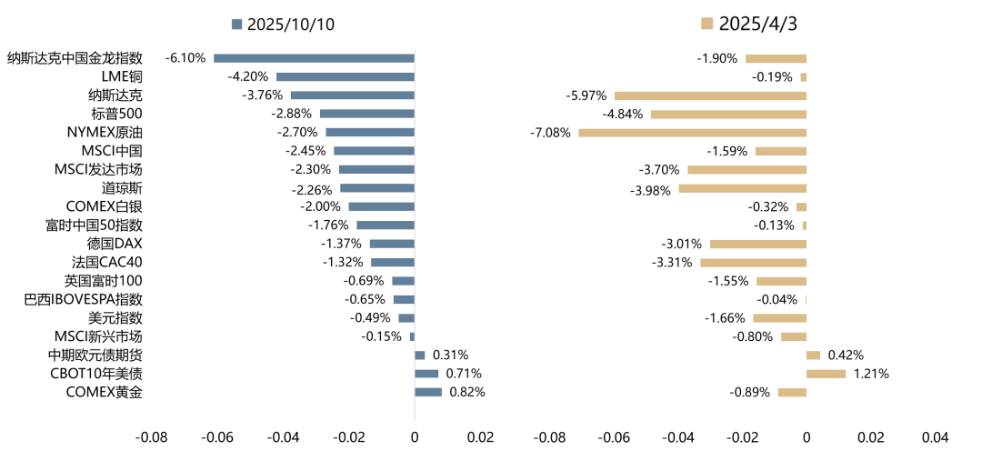 北京时间10月10日深夜,特朗普推文引发全球大类资产波动,截止当日海外收盘,股债汇齐齐下跌。不过与特朗普4月份宣布全面对等关税相比,当日美股、美元指数、原油跌幅小于4月,中概股、铜价跌幅大于4月。
