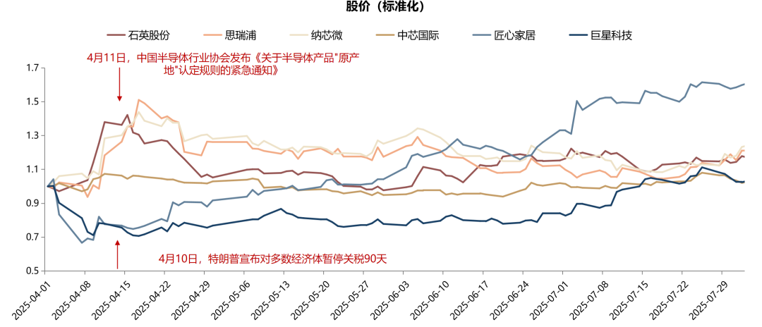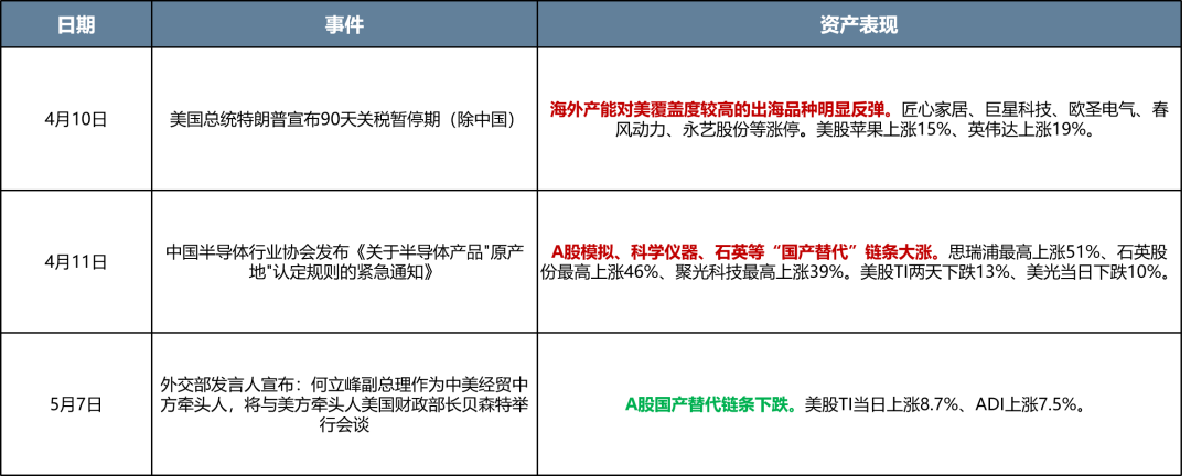 第二阶段:中国对半导体制裁&美国对多数经济体90天豁免:关税交易开启——国产替代链&对美出口链。