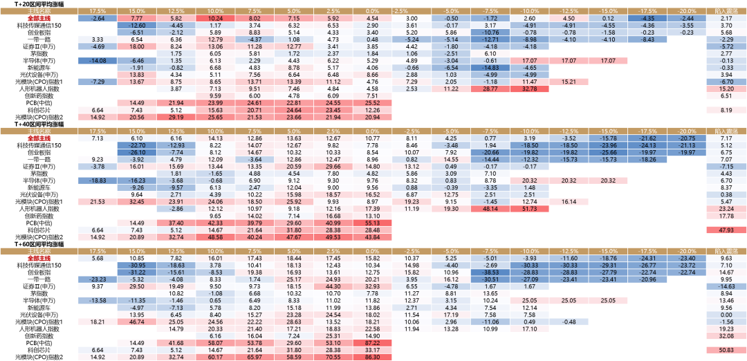 从2012年以来产业主线的规律看,陷入震荡/短线杀跌后并不代表趋势的彻底结束,只要产业趋势仍在,主线历经横盘消化后依然有创新高的机会:如下图,复盘历史主线行情,若均线偏离度下穿-5%,T+60的平均收益+5.25%;若主线陷入震荡,T+60的平均收益+9.63%。