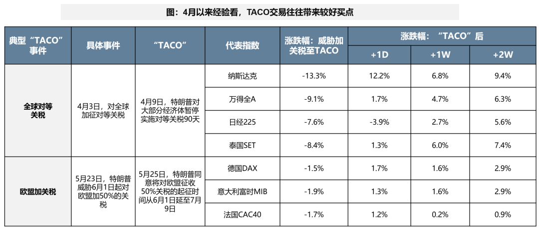 我们简单复盘4月以来两次关税方面的“TACO”交易:一是4月3日的全球对等关税,二是5月底威胁对欧盟加关税。在特朗普“威胁”后,股市可能有单日较大幅度的下跌。但“TACO”后,往往能于当日反弹,并较快的补缺口。此外,这几次的经验来看,特朗普从威胁到反复的间隔时间并不长,即下跌窗口期也有限。