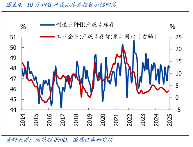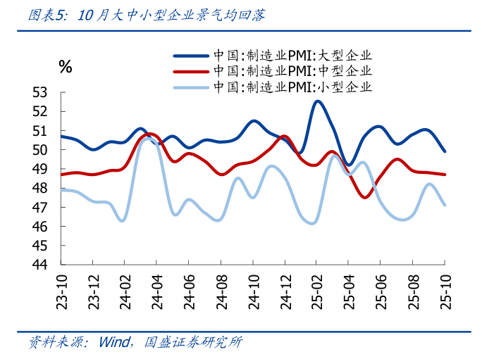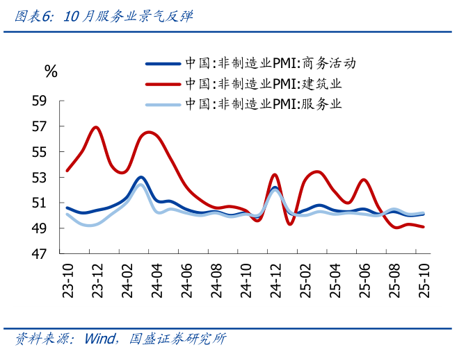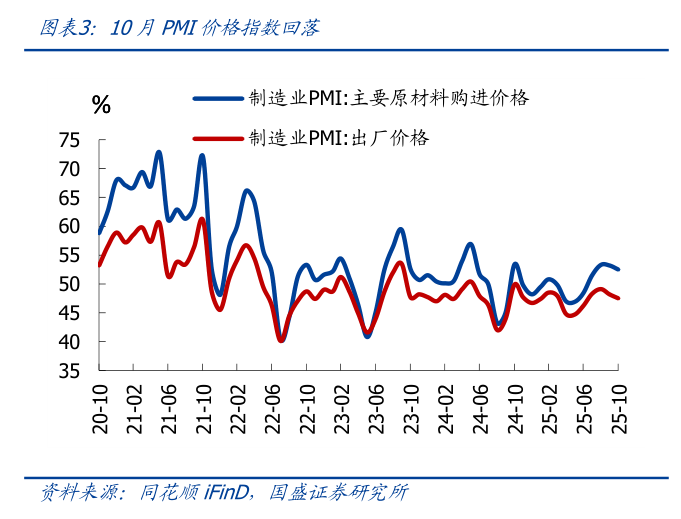 3)价格指数小幅回落,预计10月PPI跌幅继续收窄,库存回落。价格端,10月原材料、出厂价格指数分别回落0.7、0.7个百分点,指向“反内卷”政策对大宗价格的催化有所退坡,受基数明显走低影响,预计10月PPI跌幅继续收窄。库存端,10月PMI原材料、产成品库存分别回落1.2、0.1个百分点,库存减少可能与生产回落的带动有关。
