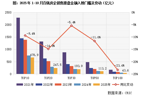 2025年10月,百强房企各梯队销售门槛较去年同期进一步降低,且门槛值均降至近年最低水平。其中,TOP10房企销售操盘金额门槛同比降低9.4%至678.9亿元。TOP30和TOP50房企门槛也分别同比降低5.4%和11.6%至193.9亿元和113.2亿元。TOP100房企的销售操盘金额门槛更是降低了23.4%至43.6亿元。