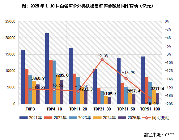 具体分梯队来看,2025年前10个月百强房企各梯队的操盘销售金额均在降低,TOP21-30房企的累计销售规模降幅相对较小,为9.3%,是唯一降幅在10%以内的梯队。