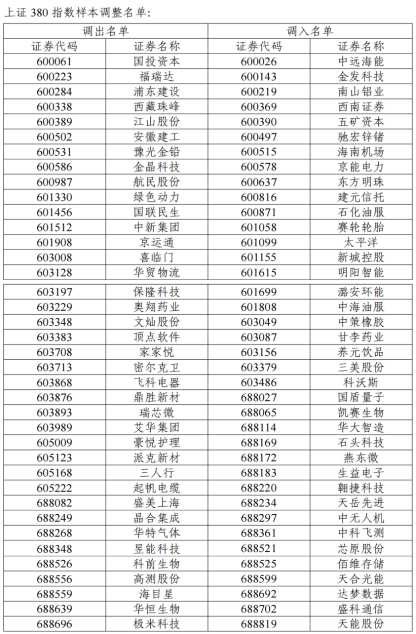 上证380指数样本股调入中远海能、金发科技、南山铝业、西南证券、五矿资本、驰宏锌锗、海南机场、京能电力、东方明珠、建元信托、石化油服等38只个股,调出国投资本、福瑞达、浦东建设、西藏珠峰、江山股份、安徽建工、豫光金铅、金晶科技、航民股份和绿色动力等38只个股。
