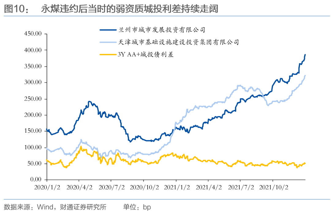 津城建当时存量债券规模巨大,运营高度依赖再融资,所在区域又有过省级企业的违约历史,因此债券持续被投资人抛售,信用利差在次年持续走阔。