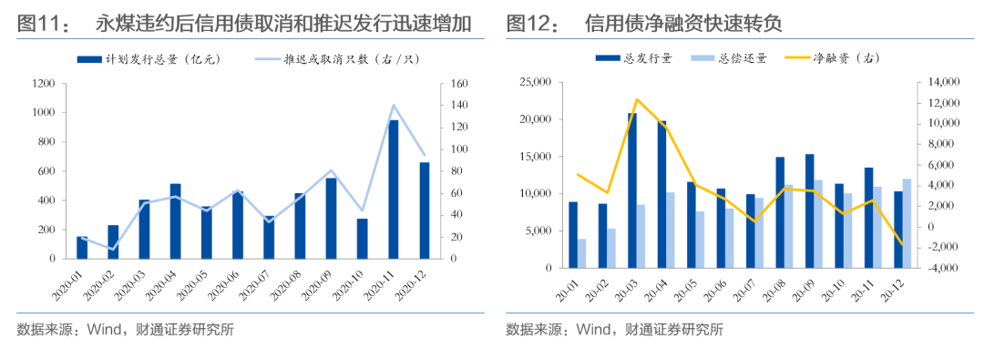一级市场上,永煤违约当月信用债取消或推迟发行金额达到952.9亿元,且冲击范围已经超出河南煤企的范畴,信用债净融资快速转负。