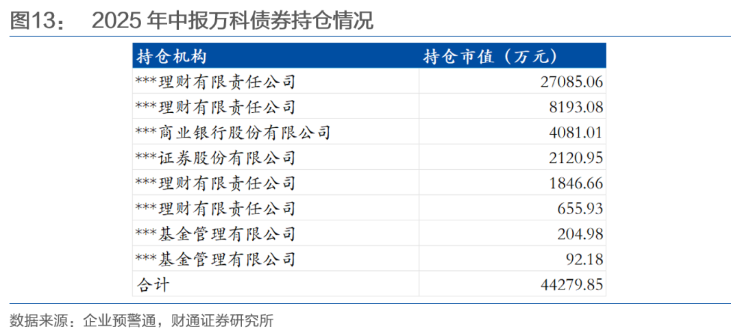 从参与的投资机构而言,当前持有万科债券的公募机构应该相对较少,我们统计了2025年中报的持仓数据,仅能观察到2家基金持有万科的债券,其他主要是体量大、扛波动能力强的理财和银行。