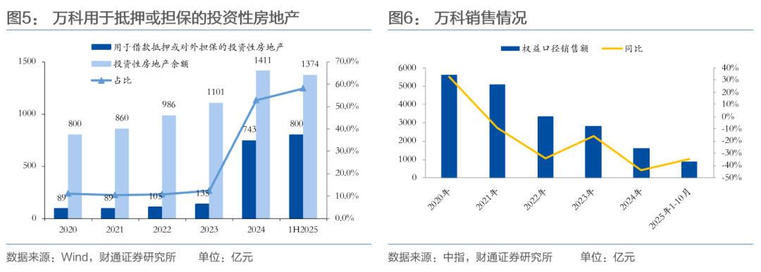 此外,万科的资产处置和销售情况都不乐观,2025年中万科投资性房地产已用于抵质押及担保的余额已高达800亿元,占投资性房地产余额的58.2%,可处置的资产越来越少。2025年1-10月权益口径销售额860亿元,同比下滑34.4%,跌幅较大,如果再考虑当前各地监管资金的情况,实际上通过销售回笼的资金已经非常有限。