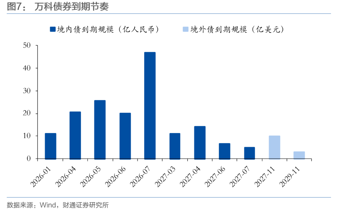 而万科面临的债券兑付压力仍不算小。从债券到期节奏来看,今年末到明年上半年是万科的偿债高峰,剔除拟展期的22万科MTN004,年内到期债券37亿元,2026年到期或行权的债券规模为124.19亿元。