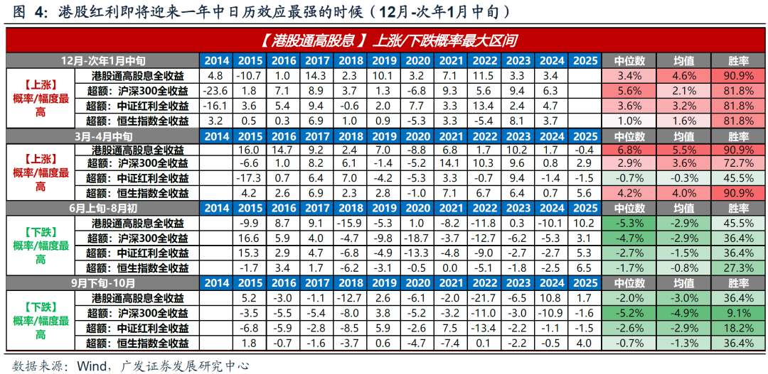 港股也是类似,港股红利即将迎来一年中日历效应最强的时段(12月-次年1月中旬)。2014年至今,港股通高股息全收益指数在12月-次年1月中旬具有较高的上涨概率和超额收益概率:绝对收益上涨概率90.9%,涨幅中位数和均值分别为3.4%和4.6%。相较于沪深300全收益:超额收益的概率为81.8%,超额收益中位数和均值分别为5.6%和2.1%。