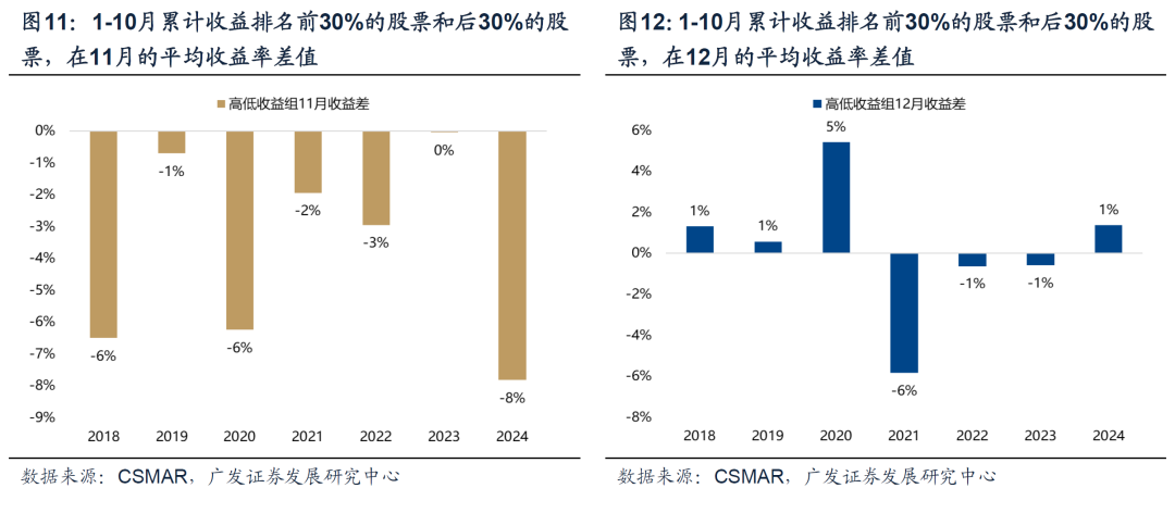 风格方面,12月大盘表现优于小盘,红利风格会阶段性占优,金融板块的平均涨幅居前(非银、银行)。年末考核期临近,各类资金诉求出现分歧、险资等机构进行资产再均衡,从而带动红利、金融等稳定类行业的表现;此外,年末监管可能加强、强化蓝筹风格(比如2016年底限制壳资源炒作、2023年底-2024年初杠杆资金暴雷)。